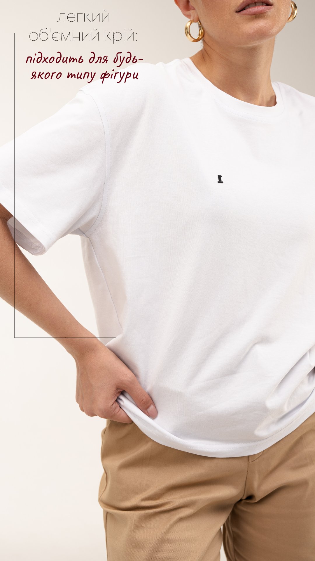 Мінімалістичний дизайн робить футболку універсальною і легко пасує до будь-якого вбрання. Ідеальна довжина дозволяє заправляти її або носити навипуск, створюючи різні образи. Легкий крій оверсайз підходить для будь-якого типу фігури, це свобода рухів та сучасний вигляд.