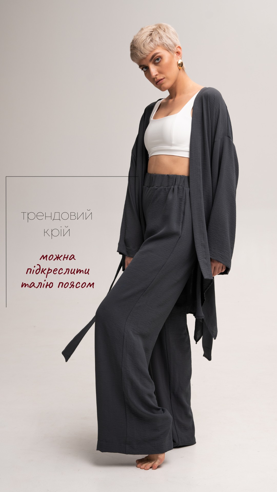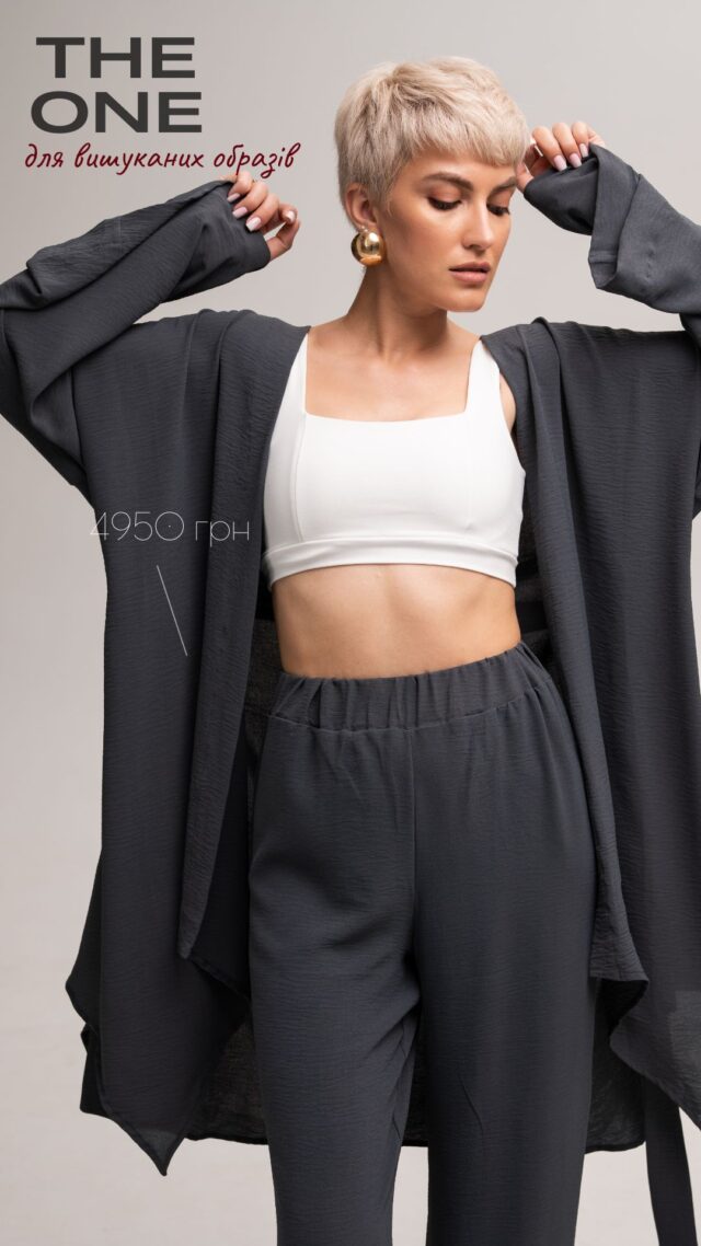 Це кімоно створено в стилі халата, що надає йому легкості та елегантності. Вільний крій забезпечує максимальний комфорт і свободу рухів, а широкий пояс підкреслює талію, створюючи витончений і жіночний силует. Широкі рукави додають нотку драматизму та вишуканості, роблячи образ по-справжньому особливим.