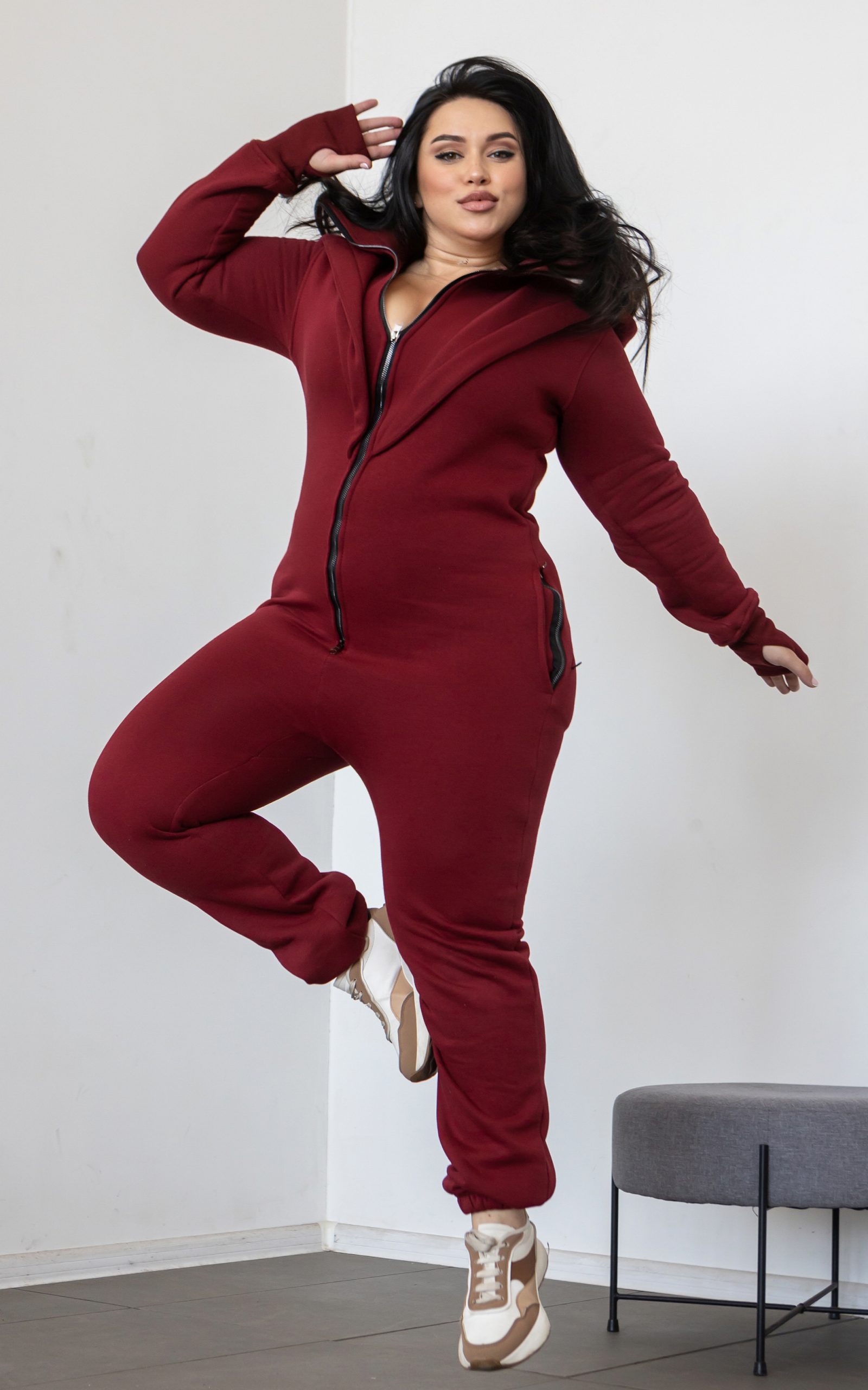 Комбінезон може бути виконаний у бежевому, бордовому або чорному кольорах.